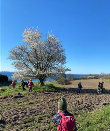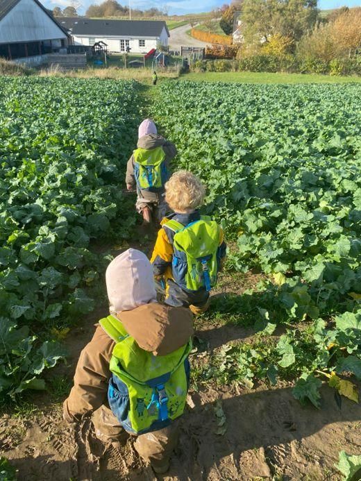 Vi tænder bålgryden på legepladsen og laver lidt let mad, griller en pølse, varm kakao eller måske fuglekugler til de sultne småfugle. Årets gang på marken følger vi hver dag tæt. Vi oplever, at marken ligger brak om vinteren, bliver sået ved forår eller efterår, at afgrøderne vokser hen over sommeren, og at høsten sættes ind på sensommeren. Ordet 'Traktor' lærer børnene lyn hurtigt! Det er stimulerende for os alle at følge gårdens liv, og vi oplever, hvordan børnene opnår en større fortrolighed med udelivet og udvikler sig både som nysgerrige tilskuere og som aktive brugere af naturens muligheder.