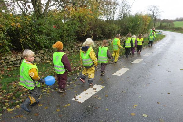 Vi har jævnlig ture med børnene langs vejen - både til fods og på cykel. Vi lærer dem om simple færdselsregler langs vejen og over vejen.