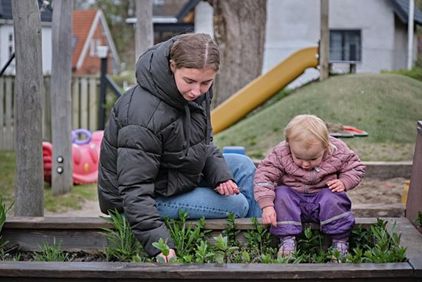 På bedsteforældredagen leger og hygger vi og planter blomster i vores højbede. Vi spiser frokost sammen og får kage, drikker saftevand og kaffe.