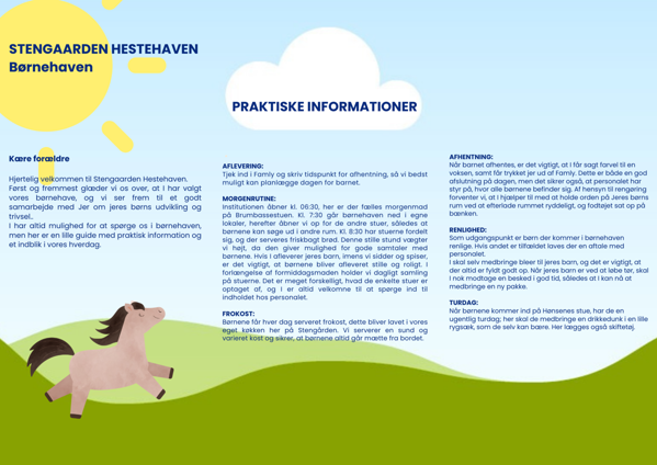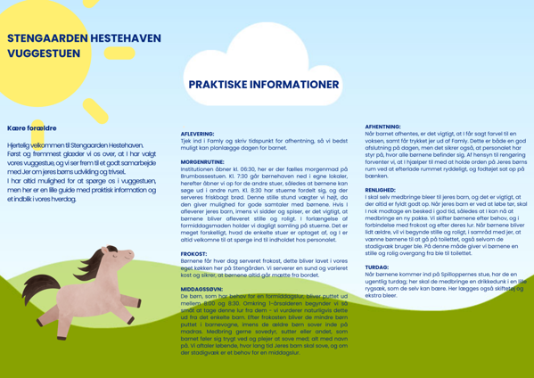 Aflevering: Når barnet bliver afleveret, er det vigtigt, at forældrene tjekker barnet/børnene ind på Famly og får skrevet tidspunktet for afhentning. Det giver os mulighed for at planlægge dagen for jeres børn på den bedst mulige måde. Morgenrutine: Institutionen åbner kl. 06:30, hvor der er fælles morgenmad på Brumbassestuen. Kl. 7:30 åbner vi op for de andre stuer, således at børnene kan søge ud i andre rum. De børn, som har behov for en formiddagslur, bliver puttet ud mellem 8:00 og 8:30. Kl. 8:30 har stuerne fordelt sig, og der serveres friskbagt brød. I forlængelse af formiddagsmaden holder vi dagligt samling på stuerne. Det er meget forskelligt, hvad de enkelte stuer er optaget af; det kan være sange, fortællinger, rim og remser, osv. Kl. 10:45 får børnene serveret frokost. Dette bliver lavet i vores eget køkken her på Stengården. Vi serverer en sund og varieret kost og sikrer, at børnene altid går mætte fra bordet. Efter frokosten bliver de mindre børn puttet i barnevogne, imens de ældre børn sover inde på madrasser. Børnene i barnevognene får som udgangspunkt lov til at sove så længe, de kan, men hvis der er behov eller ønsker fra forældrene om et tidspunkt, de senest skal op, så vil dette selvfølgelig kunne aftales. Om eftermiddagen kl. 14:00 vil der blive serveret eftermiddagsmad. Derefter er Brumbasserne som regel inde og lege indtil afhentning. Dog ved 15:30/16:00-tiden vil de børn, der ikke er hentet, som regel blive fulgt af en tilknyttet voksen ned i børnehaven, hvor de vil blive indtil institutionens lukketid. Spilopperne vil vurdere på dagen, om grupperne bliver inde eller om de går ud på legepladsen. Ved afhentning af børn er det igen vigtigt at få sagt farvel til en voksen, samt at checke barnet/børnene ud på Famly.
