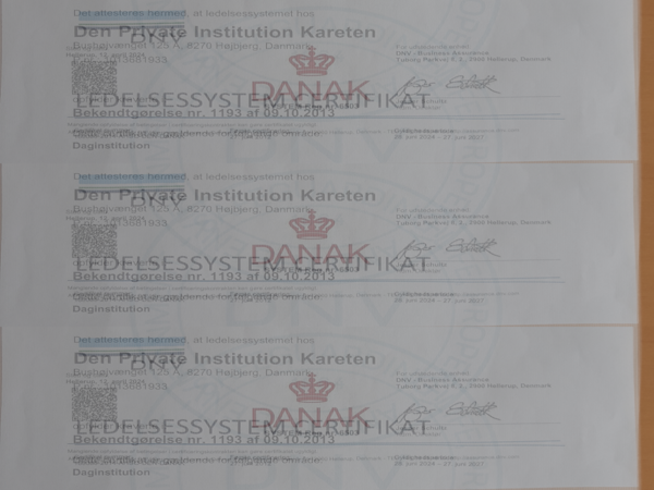 Et godt arbejdsmiljø er et vigtigt fundament under et godt læringsmiljø for børnene. Vi er certificerede i arbejdsmiljøet. Vores certifikat gælder fra 2024-27.