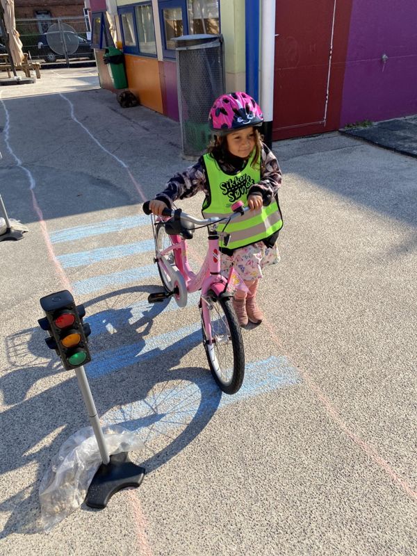 En gang om året holder vi trafikdag for børnehavebørnene. Jo mere vi taler med børnene om trafik og øver det med dem, når de er små, desto sikrere bliver de også i trafikken. Efter en periode med fokus på trafik skal børnene medbringe deres egen cykel og cykelhjelm og gennemføre en cyklistprøve. Alle børn modtager et diplom som anerkendelse for deres indsats.